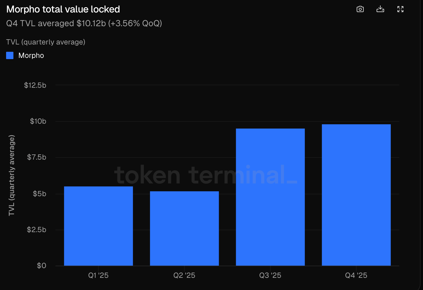 我們來看看 Morpho 的基本面,是否具備挑戰 Aave 借貸王座的潛力。根據 Tokenterminal 數據,2025 年 Q3 和 Q4,Morpho 協議 TVL 持續維持在 95 億美元 以上,較上半年增長約 80%;