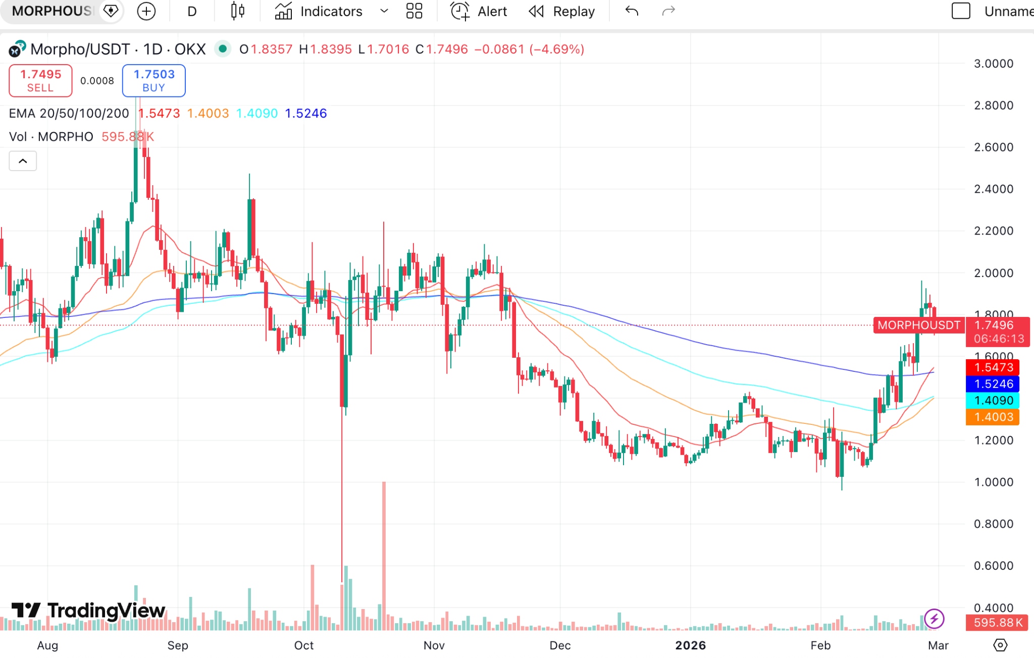然而,就在這種整體萎靡之下,MORPHO 代幣卻從 2 月初低點 0.96 美元反彈至 1.8-1.9 美元區間,逆勢翻倍。從日線圖上看,這波反彈已基本走出圓弧底形態,或許是一種底部反轉訊號。這種上漲究竟是市場情緒的短暫推動,還是基本面與結構性變量共振下的趨勢啟動?