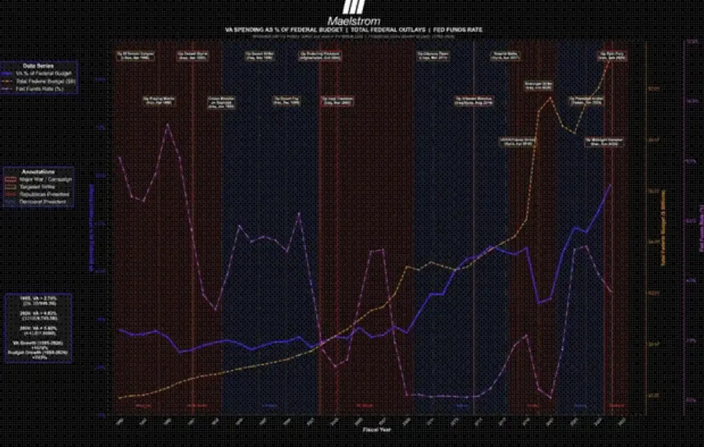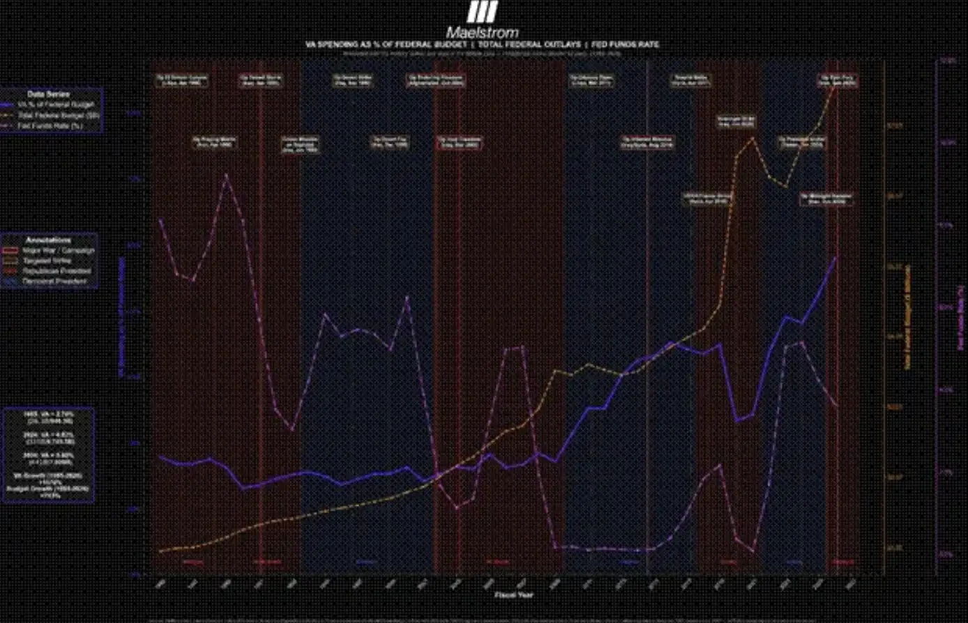 從宏觀層面看,這張圖試圖呈現戰爭所帶來的人類成本。圖中以三個指標為核心:美國聯邦預算中用於退伍軍人事務部(Veterans Affairs,VA)的支出佔比、聯邦政府名義總支出規模,以及有效聯邦基金利率(Fed Funds Rate)。同時,圖表還標註了一系列具有代表性(但並不窮盡)的美國對中東國家發動的飛彈打擊或全面戰爭事件。