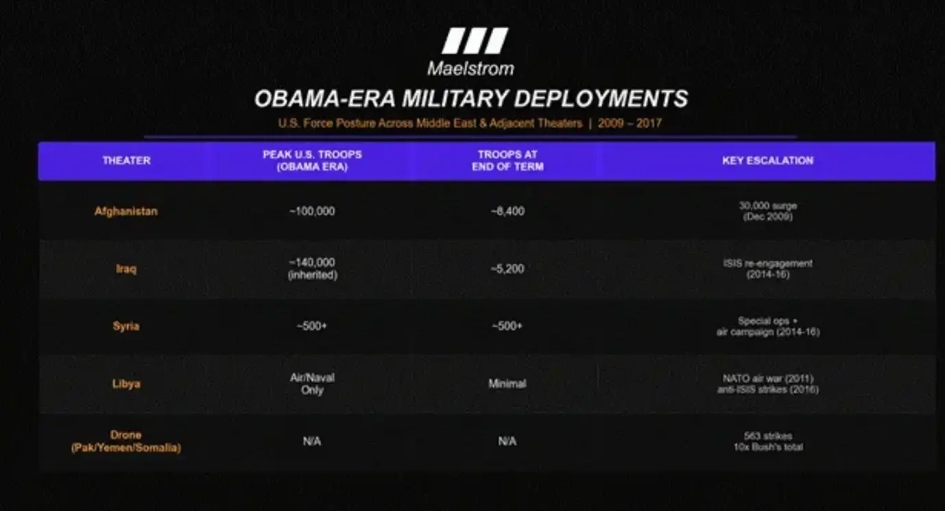 歐巴馬雖然沒有發動新的大規模中東戰爭,但他確實 擴大了阿富汗戰爭中的駐軍規模(即所謂的「增兵行動」),因為在他看來,那是一場「正義的戰爭」。