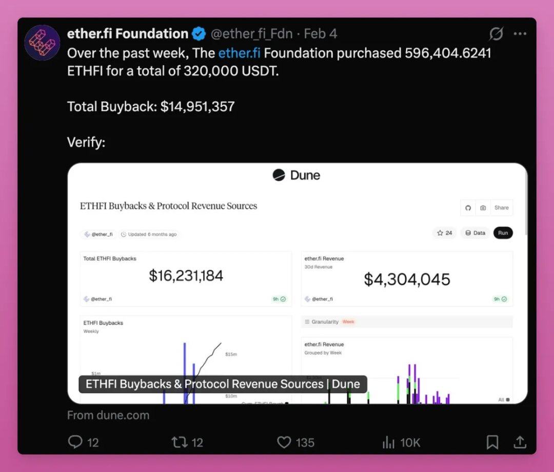 - ether.fi 每月透過回購分給持有者 150 萬美元。