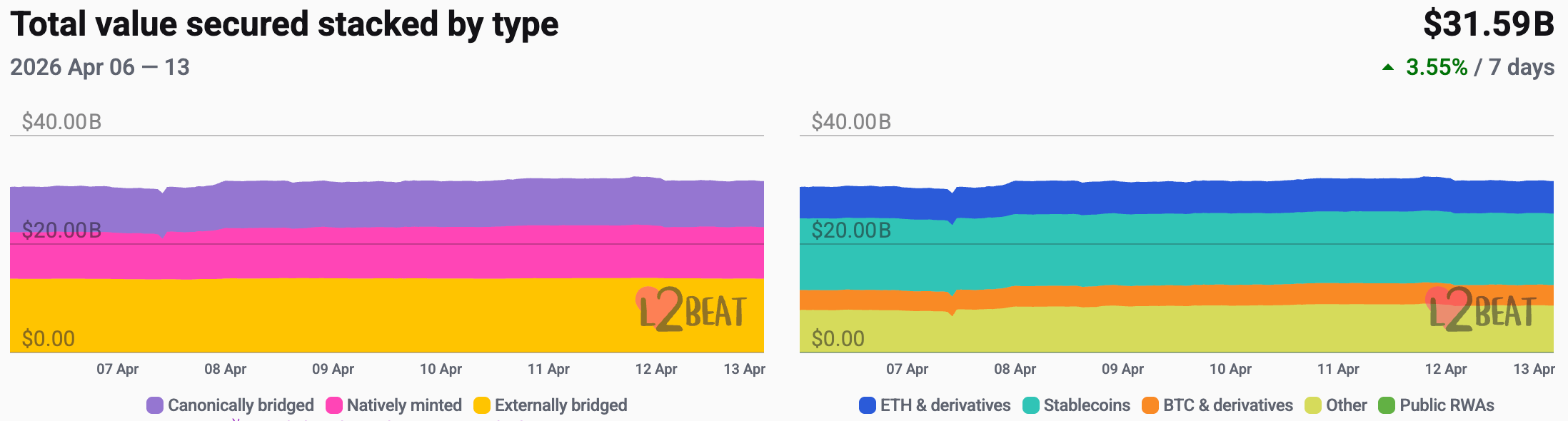 據 L2Beat 數據顯示,本週以太坊 Layer2 總 TVL 為 315.9 億美元,較上週 307.0 億美元上漲 2.89%。