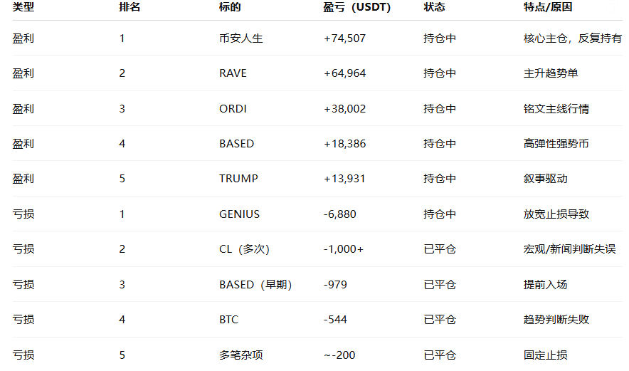 - 盈利模式非依賴每單盈利,而是透過多數交易嚴格止損,由少數標的(如ORDI、RAVE)貢獻絕大部分利潤。