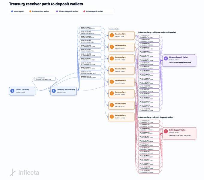 From July 21-26, a wallet strongly associated with Ethena distributed 150 million ENA to exchanges via nine intermediary wallets. Approximately 1.5 months later, another Ethena-affiliated cluster withdrew approximately 134 million ENA from Binance.
